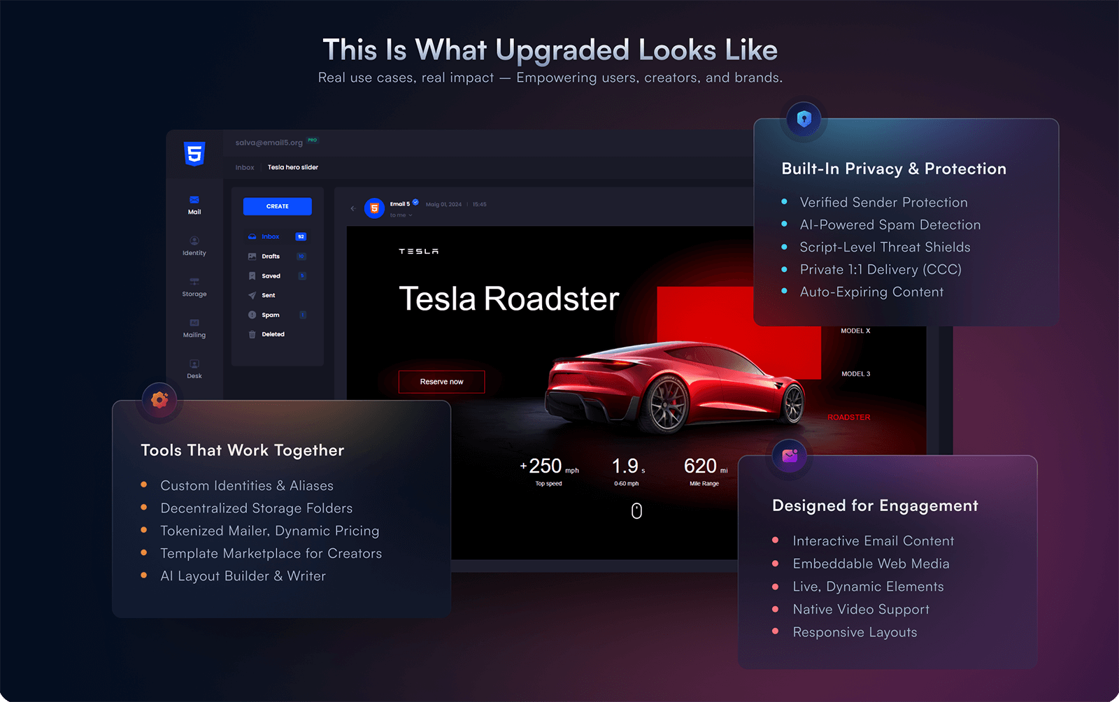 Get a piece of the new email standard from day one—powering pay-per-email campaigns, enabling the template marketplace with creator royalties, and supporting core functionality across the platform.